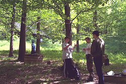 Másnap Balázs már kora reggel majomként függött a fán, amit persze nem lehetett kihagyni… A reggeli után indult a verkli, miután különbözõ rémisztgetésekkel elláttak minket a cirkáló pályaõrökkel, feladatokban bõvelkedõ ellenõrzõ pontokkal kapcsolatban. Persze látva, hogy mindössze három ellenõr indult el a házból, sejteni lehetett, hogy a dolog mégse lesz annyira vészes. Az ötpercenkénti indítás ellenére hamar kisebb csoportokba torlódott a mezõny, s jöttek sorra a bóják is, csak éppen ember nem volt sehol… Aztán a negyedik bójánál, a Lajos-forrás melletti vadászháznál már nem lehetett tovább húzni a dolgot: mindenkinek testre szabott kínzások jutottak. A legfontosabb a kirándulás mottójává váló "pótizzó, pótelem" volt, no meg persze a tökéletes felszerelés a hátizsákban, és a tudás a fejben. Innen következett az út legizgalmasabb szakasza, a galád módon elrejtett ötödik bója az Oldaltmászó-kútnál, amit nem is mindenkinek sikerült megtalálni, mi is elkavartunk a hegyoldalban… Itt volt a leginkább szükség a tájékozódásra, és itt jutottak a legkínosabb percek majdnem mindenkinek. Aztán laza sétával lecsorogtunk Badár Sanyi bácsihoz, akinél tájoltunk és távot mértünk. Ezután már közel volt a turistaház, de szegény Zsuzsit még itt is el tudták téríteni útjából: gaz módon elbizonytalanítva, ketten közrefogva ismét elindították a körre, immár másodszor! Szerencsére azért nemsokára sikerült kikeverednie a csávából.