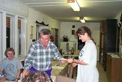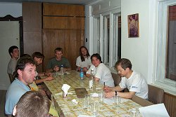 Rövid pihenõ után máris indult a borzasztó vizsgatortúra: elõször a feladatlapokkal küzdöttünk meg. Szerencsére a szigorú bizottság néha kiment friss levegõt szívni, így nem kellett folyton a hideg tekintetek kereszttüzében remegõ kézzel körmölni a mondatokat : ). Ezzel együtt nem volt könnyû dolgunk, de színvonalas és a megadott témákból jól kiválasztott, értelmes feladatokkal néztünk szembe, köszönet az összeállítónak! Már egész felszabadulttá vált a hangulat, mikor megkezdõdött a bizottság munkája: Kovács Balázs és Rosztóczy András rendíthetetlen szigorral nekiláttak a javításnak. Néhány egész kivételes megoldást csillaggal láttak el, hogy az utókor is emlékezzen rájuk, ilyen volt pl. az én nejlonzacskón keresztüli mesterséges lélegeztetésem [fõ a higiénia, avagy próbáld ki az anyósodon : ) ]. A végeredmény: 60-70-80 pontos dolgozatok, évek óta a legjobb átlaggal (bár javítóink egy dolgozatot annyira eredményesen számoltak, hogy majdnem alulról ütötte meg a mércét, de késõbb kiderült, hogy egy oldal kimaradt a dolgokból…). Így mindenki boldogan térhetett aludni, és már kicsit kevésbé izgulva vártuk a holnapi túrát. |