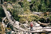 Az utunk most csetri falvakon vezet keresztül. A házak fõleg agyaggal tapasztott fából készültek. Jellemzõ a szalmatetõ, de mivel még elég közel vagyunk a civilizáció magasabb (?) fokához itt-ott találunk hullámpalát is. Az állatok tartására szolgáló ólak többnyire vékonyra hasított, gyékényszõnyeg-szerûen szõtt bambuszlepedõvel fedettek. Khudinál átkeltünk egy öreg függõhídon. Lábunk alatt keményfa lécek és bambuszrudak kusza egyvelege. Figyelni kell hova lépsz. Már jócskán benne járunk a délelõttben, ezért aztán a teaházak és éttermek elõtt kedves invitálásban van részünk. Mi azonban meg sem állunk a szép nevû Bulbuléig. Itt kísérõink megebédelnek, mi pedig egy kis frissítõt fogyasztunk. Ismét átkelünk a Marsiandin és megérkezünk a nap elsõ rendõrségi ellenõrzõ pontjához. Pecsételünk, majd az egyre sûrûsödõ öszvérforgalommal kísérve megérkezünk Ngadiba. Közben meg-meg állunk. Ray barátunk lemaradozik a holminkkal degeszre tömött zsákkal. Így van idõnk megnézni a folyó sodrával küzdõ vadvízi túrázókat. A kemény csatát a helybéliek is érdeklõdve szemlélik. Szó se róla, nem mindennapi látvány amikor egy terjedelmes gumitutajt 6-8 - szemmel láthatólag nagyon amatõr - evezõs próbál meg levinni néhány csintalan zúgón. |