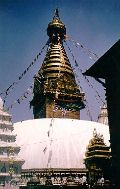 A lépcsõ tetején egy aranyozott villám-köteg fogad bennünket és elõttünk a stupa. Körös-körül hindu és buddhista zarándokok. Hosszú sorok várnak arra, hogy áldozatot mutathassanak be. Pörögnek az imamalmok, égnek az áldozati tüzek, több mázsa áldozati rizs röpköd a levegõben ( a termékenység szimbóluma ), füst és tömjén illat. Sajnos töredékét sem tudjuk annak ami ahhoz kellene, hogy értsük is mi történik körülöttünk. De ottlétünk még így is nagy élmény. Érdekes a vallás és az üzlet látható keveredése. A hívõk áhítata és a takarító személyzet szenvtelen sepregetése közötti ellentét. A turisták érdeklõdõ ámélkodása és a vallásos embereknek a hely iránti tisztelete. Minden szempontból értékes találkozás volt ez Katmandu egyik legnevezetesebb helyével. Lefelé lépdelve összeismerkedünk a komplexum másik nevének képviselõivel is - tudniillik Majom-templomként is szerepel az útleírásokban - de most csak kis számban mutatkoznak.