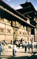 Ámde alig pár lépésnyire van innen a Durbar Square, az egyik fõ látványosság. Hindu és buddhista templomok - vagy két tucat, a volt királyi palota és az Élõ Istennõ háza. Gyönyörû faragások fából és kõbõl és az elõzõ napok ünnepének maradványai.