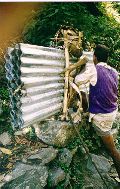 Hiába no, a nyilvános WC-k területén Nepálnak még van behozni valója. Miután barátunk megnyugtatta zaklatott bélmûködését ismét lendületesen haladunk. A folyóvölgy itt már nagyon meredek. Az utat nem ritkán a függõleges sziklába vájták. Körülöttünk egyre gyakrabban susog a bambusz. Nincs köztük idõs példány. Talán korábban erdõtûz lehetett itt. Mással nem nagyon magyarázható az egyöntetû állomány. Rójuk a hepehupákat és bizony fáradunk. Tal elõtt egy impozáns vízesésben gyönyörködhetünk. Egy mély szurdokvölgyben tajtékzik a víz, majd beömlik a Marsiandiba. Az útleírásból tudjuk, hogy a mi folyónk is valami hasonló tüneményt produkál néhány száz méterrel odébb, de a zuhatag megközelíthetetlen. Nem is nagyon erõltetjük a dolgot. |