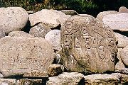 Kodoban pecsételünk és egy pillantást vetünk a Nar Khola völgyére. Itt tilos a bemenet. Az elzárt területen nem szívesen látják az idegent. A kölcsönös hátrányokkal járó találkozást állandó fegyveres õrség igyekszik megakadályozni. Minket azonban most Chaméba vezet az útitervünk. A völgyben eddig ez a legnagyobb település. Üzletek, rendõrség posta, sõt valódi telefonállomás. Minket azonban nem nyûgöznek le ezek a világi hívságok, csak törtetünk elõre. Azaz csak törtetnénk, mert Mihály barátunk úgy látszik tartósan összeszûrte a levet valami bacival. Sûrûn és diszkréten el-el vonul egy alkalmas bokorba. Így aztán a falu végén van idõnk gyönyörködni az egész túra talán legszebb mani-falába. Ha még nem említettem volna, a mani-fal afféle szent hely, ahol kõbe faragott ima szövegek vannak feltornyozva. Aki állította és aki megérinti, annak imája eljut az istenekhez. Itt a közeli folyó legömbölyített köveire vésték a szöveget. Nekünk hitetleneknek is megkapó látvány, biztos az égiek is szívesen szemlélik. Hogy mit jelentenek a betûk? Senki sem tudta megmondani. Régi tibeti szövegek. Ez volt a legkonkrétabb válasz amit ki tudtunk szedni a helybéliekbõl. |