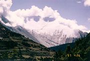Felfedezünk egy térkép által nem jelzett hidat. Kicsit csodálkozunk az útvonal módosításon, de átmegyünk. A régi út nyilván az esõzések áldozata lett. Dharapaniról semmilyen emléket nem õrzök, pedig hivatalos pecsét bizonyítja, hogy ott jártam, Bagarchap viszont élénken megmaradt bennem. A bejárat után, a völgy közepén magányos sziklaszál. Dögkeselyûk fészkelnek rajta. Nagyon hasznos madár de annak, hogy itt tartósan megtelepedett szomorú oka van. Néhány lépéssel odébb két kis emlékmû. Két kanadai fiatalember neve van rávésve, akik '95-ben itt haltak meg - és rajtuk kívül még 300 helybéli. A fél falu. Rájuk omlott a szomszéd hegyoldal.